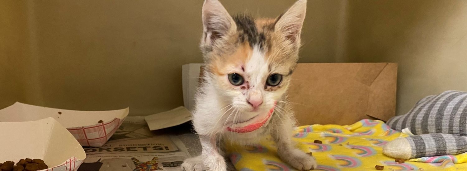 A one-month-old kitten, now named Roo, who was found with her front leg partially amputated and crudely wrapped in duct tape