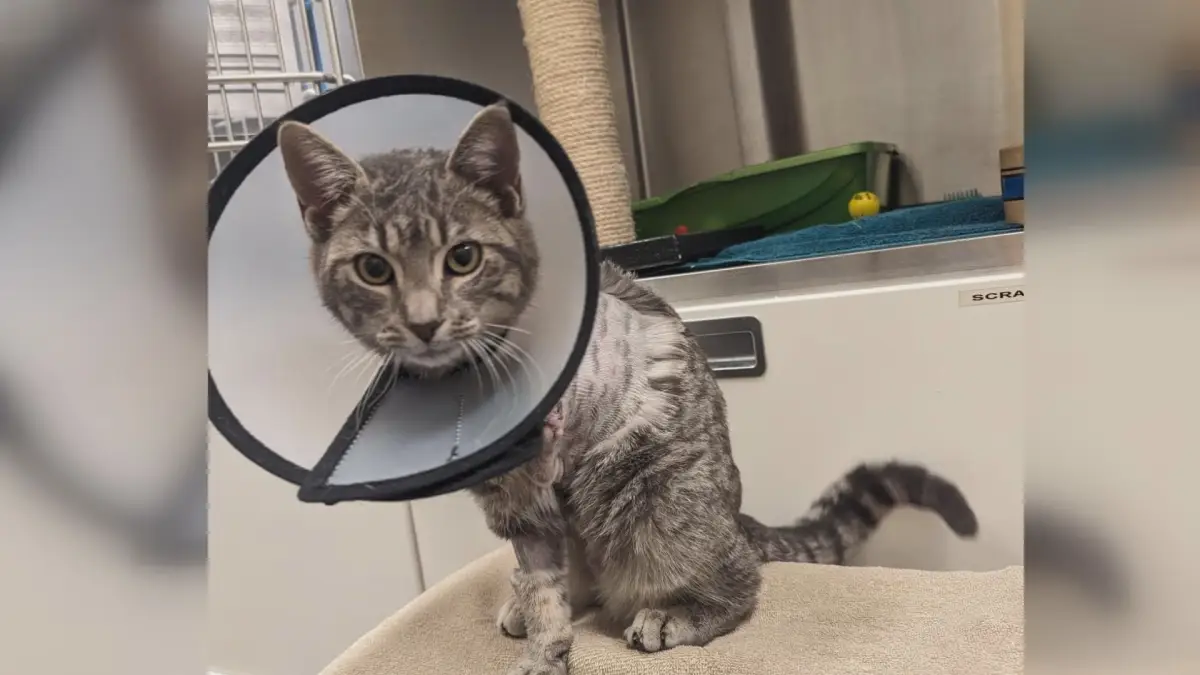 A one-month-old kitten, now named Roo, who was found with her front leg partially amputated and crudely wrapped in duct tape