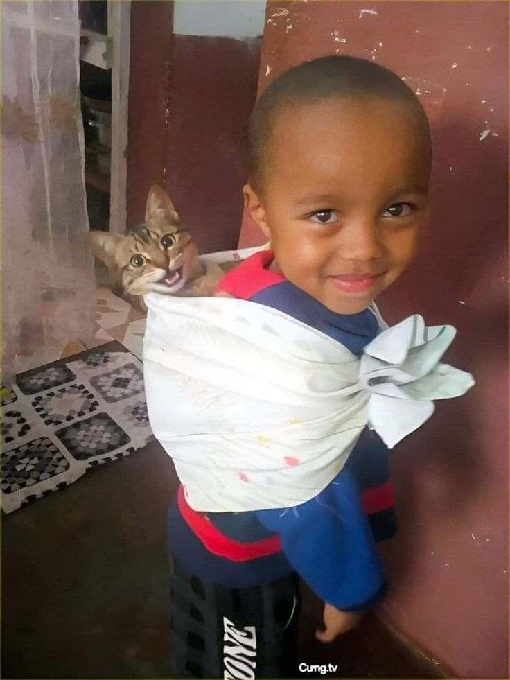 On a quiet day in the village, a small boy with the brightest smile walked along the dusty road. His steps were light, his spirit radiant, but what made the scene unforgettable was the tiny bundle tied gently to his back. Inside, wrapped with care as though it were the most precious treasure, was his kitten ๐ฑ.