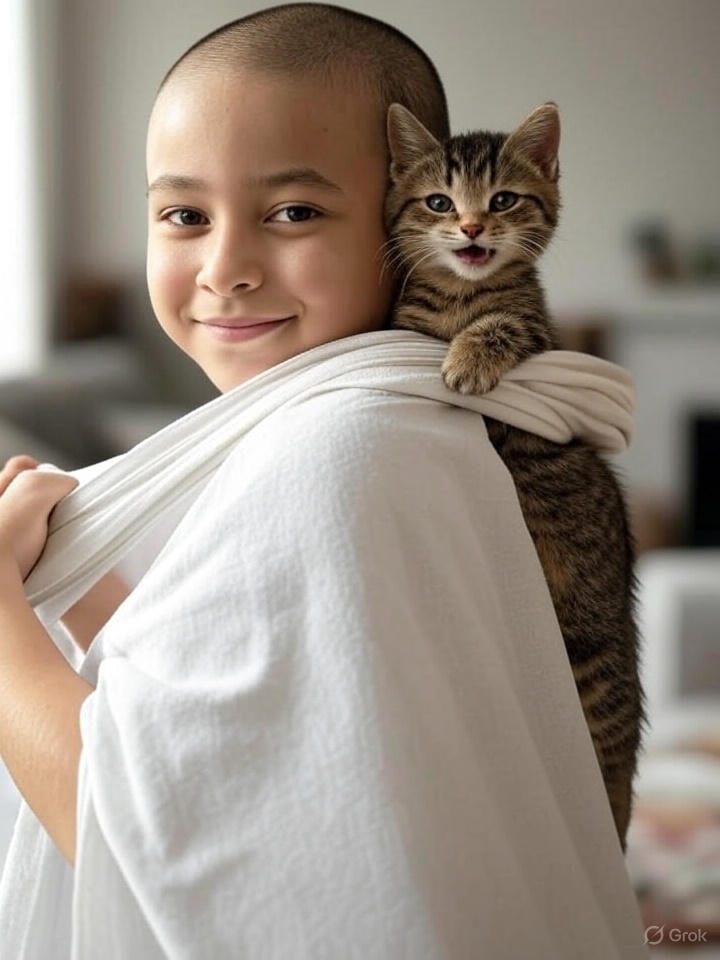 On a quiet day in the village, a small boy with the brightest smile walked along the dusty road. His steps were light, his spirit radiant, but what made the scene unforgettable was the tiny bundle tied gently to his back. Inside, wrapped with care as though it were the most precious treasure, was his kitten ๐ฑ.