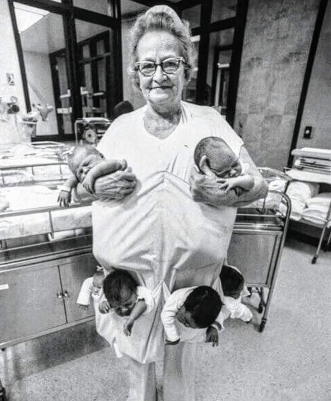 In 1968, at a hospital in the United States, nurse Vera Leonard modeled an invention that stunned the world: an apron fitted with six large pockets โ each designed to hold a baby. The purpose was as practical as it was daring: to evacuate newborns quickly in case of a hospital fire ๐๐ฅ.