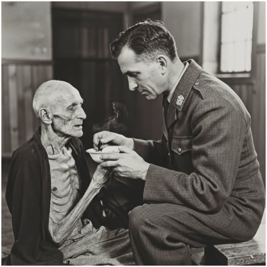 Then, in the chaos of liberation, a quiet moment unfolded. An American soldier knelt beside him, gently raising spoonfuls of broth to the prisoner’s mouth. “Don’t give up,” he whispered softly. 🥣🙏