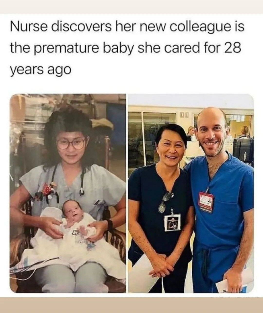 Twenty-eight years later, fate brought them back together β not as nurse and patient, but as colleagues in the same hospital. She looked into the eyes of the man before her and saw the miracle she once cradled. Now a doctor, he stood beside her, saving lives just as she once saved his. π©ββοΈπ¨ββοΈ