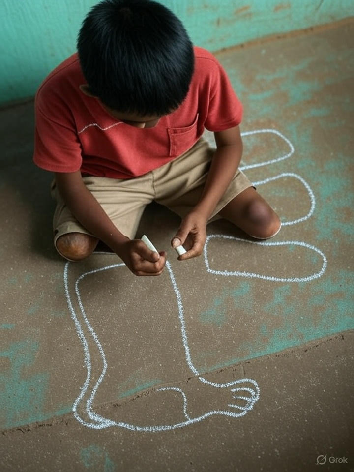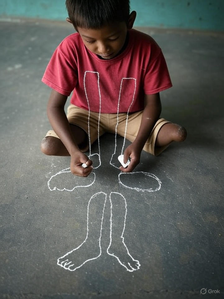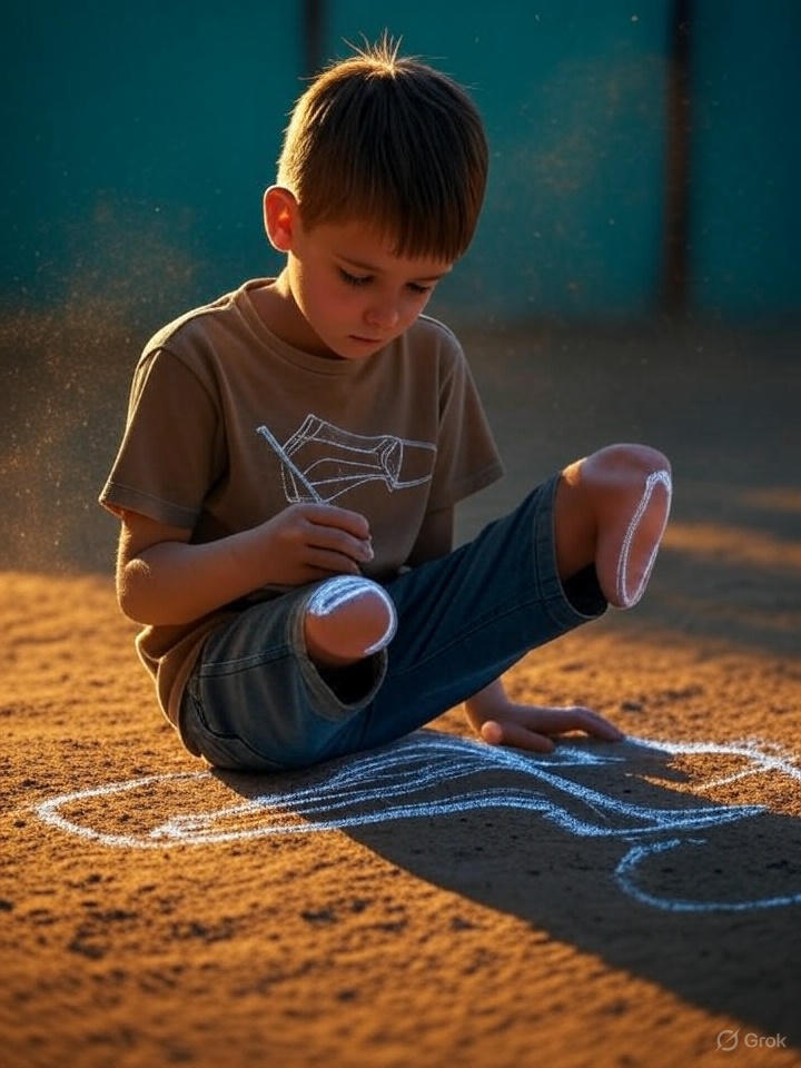 First a foot, then another. Careful curves for ankles. Straight lines for shins. Knees like small moons, calves like soft hills. The outline grows, steady and sure, until the boy is matching the world to the map that lives in his head. These aren’t the legs he lost. These are the legs he’s keeping—on the ground, in his heart, in the future he refuses to give away. 🖍️💔
