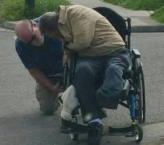 While driving home from an appointment at the Fresno VA, he suddenly made a U-turn. We noticed a man in a wheelchair struggling on the other side of the road, completely alone.