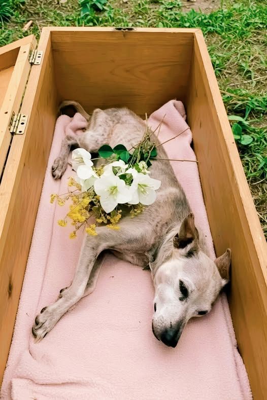 Now he rests peacefully, wrapped in a blanket and surrounded by flowers β as if even in death, his loyal heart deserves to be honored like the noble soul he was. πΉπ―οΈ It is a gentle but aching reminder: love never ends, even when breath does.