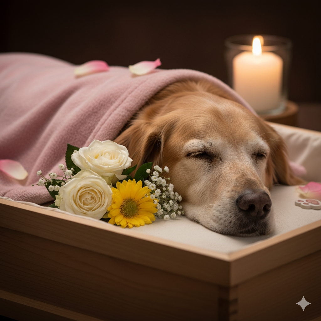 Now he rests peacefully, wrapped in a blanket and surrounded by flowers β as if even in death, his loyal heart deserves to be honored like the noble soul he was. πΉπ―οΈ It is a gentle but aching reminder: love never ends, even when breath does.