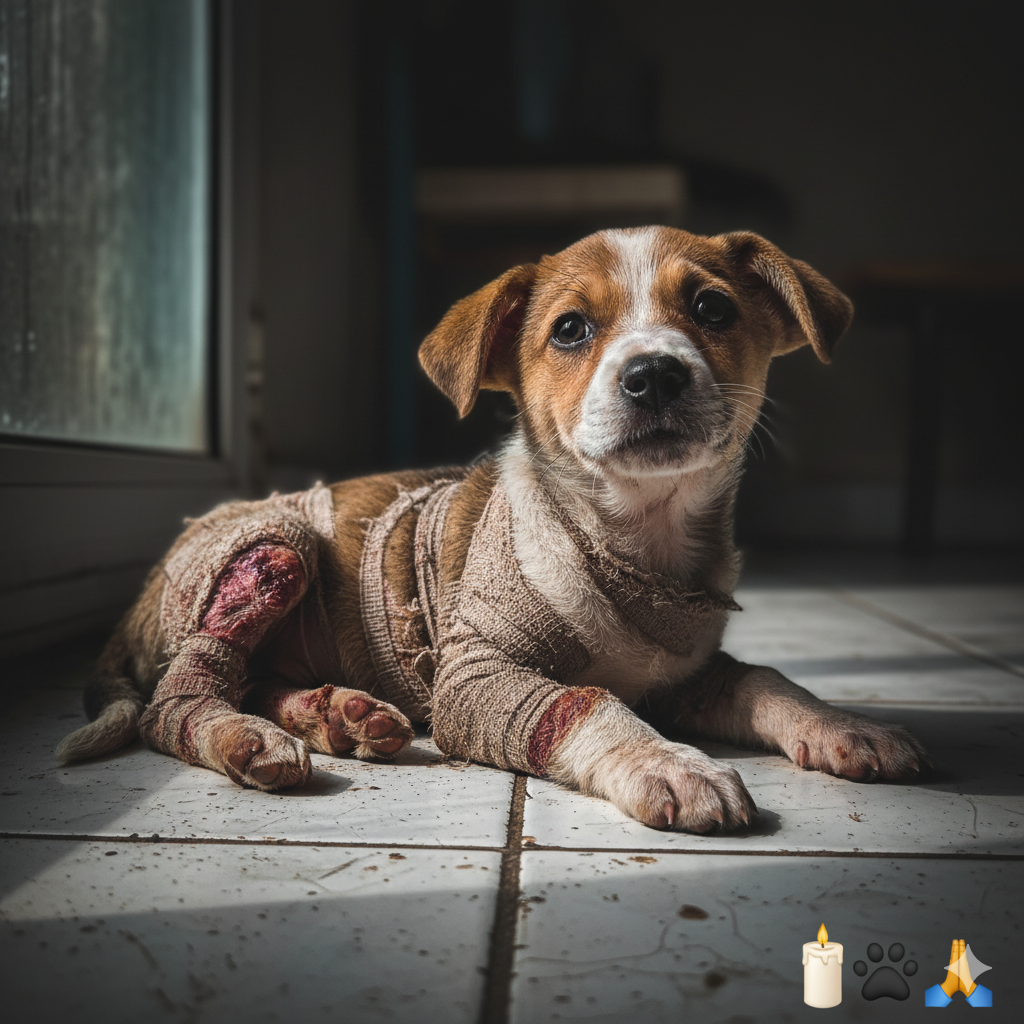 He was small, frail, and broken. Wrapped in heavy bandages, his tiny legs lay wounded and still. Every step of life had been stolen from him, and pain was the only thing his body seemed to know. ๐ Anyone looking at him might have thought there was no hope left.
