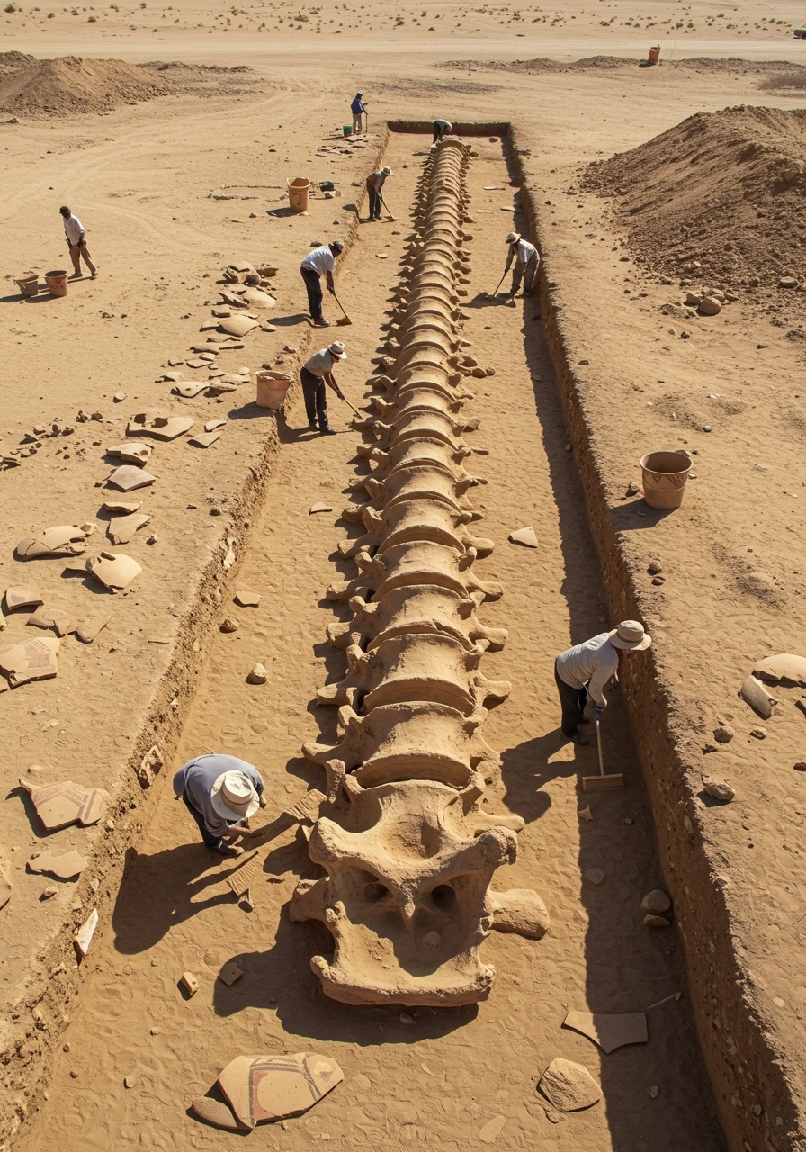 BREAKING NEWS: The ongoing excavation in the remote arid zone has escalated from extraordinary to terrifying. Following the discovery of the colossal skeleton, the latest and most disturbing find has been dubbed the DESERT DREADNAUGHT: a massive, fully articulated vertebral column—a GIGANTIC SPINE UNEARTHED IN DESERT that has deeply SHOCKS ARCHAEOLOGISTS. Its unique structure suggests a creature of unimaginable power and size.