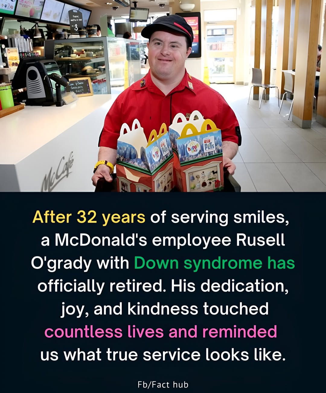 For 32 years, Russell O’Grady woke up each day with purpose. He put on his McDonald’s uniform, walked into the restaurant, and gave the world a gift far greater than any burger or fries — a smile, a greeting, and a reminder of what human dignity truly looks like.