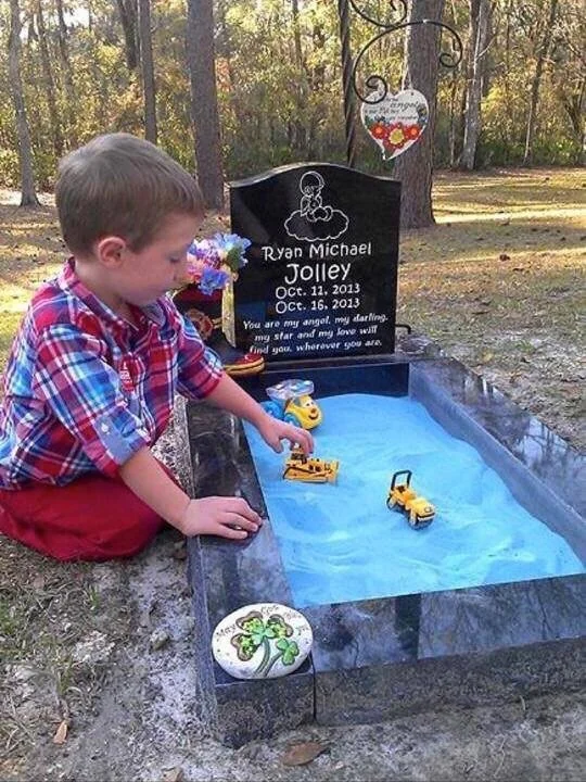 Beside Ryanโs headstone, she placed a small sandbox โ filled with soft white sand and toy trucks. It wasnโt just decoration. It was for Tucker, Ryanโs big brother, to come and play. Every visit, Tucker would drive his little tractors through the sand, giggling and chatting to the brother he never got to grow up with. ๐๐ฆ