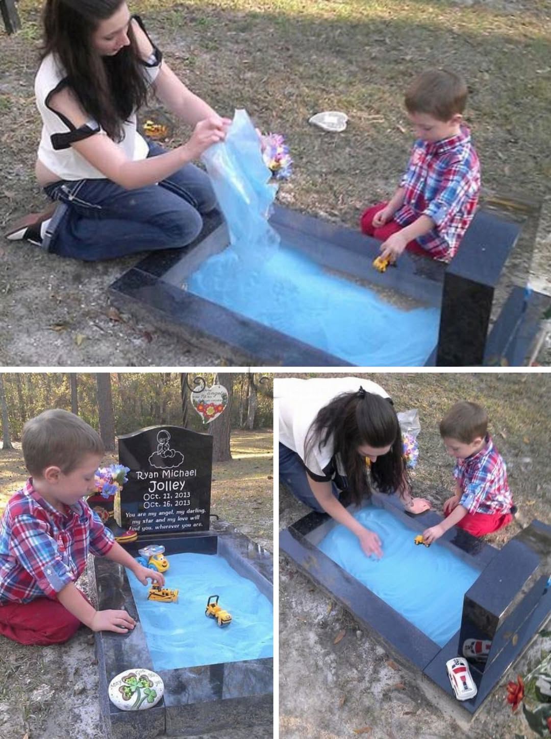 Beside Ryanโs headstone, she placed a small sandbox โ filled with soft white sand and toy trucks. It wasnโt just decoration. It was for Tucker, Ryanโs big brother, to come and play. Every visit, Tucker would drive his little tractors through the sand, giggling and chatting to the brother he never got to grow up with. ๐๐ฆ