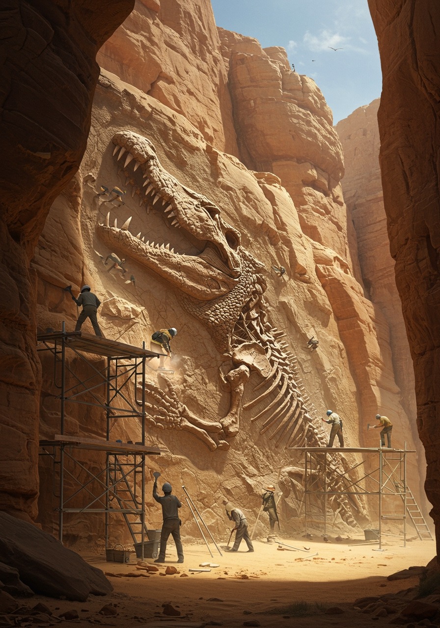 While the mystery of the carving captivates the public, paleontologists are focusing on the creature itself. Preliminary data suggests the giant predator represents a new genus of apex carnivore, characterized by massive serrated teeth and unusually dense bone structure, optimized for speed and incredible bite force. The fossilized remains were exceptionally well-preserved within the sedimentary layers of the canyon, providing a rare opportunity for deep-time biological research. This groundbreaking desert discovery will undoubtedly force a major revision of the food chains and ecological balance of the prehistoric era, securing its place as one of the most important paleontological finds of the century, regardless of the enigma carved above it.