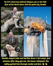 Born blind ๐, Michael couldnโt see the plane hit, the flames rising ๐ฅ, or the debris falling ๐งฑ โ but he felt the building tremble beneath his feet ๐ and heard the panic spreading through the halls ๐จ. By his side, as always, was his loyal guide dog, Roselle ๐๐ โ a calm, golden Labrador who had just woken from a nap ๐ค when the world around them erupted in chaos.