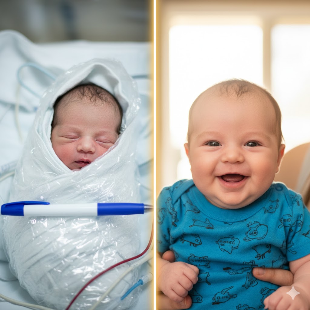 On the left β a fragile miracle, wrapped in plastic, smaller than a pen, skin so thin you could see the life pulsing beneath it π©΅. His heartbeat was faint, his breaths uneven, and doctors whispered their fears β βHe might not make itβ¦β π