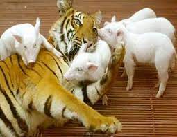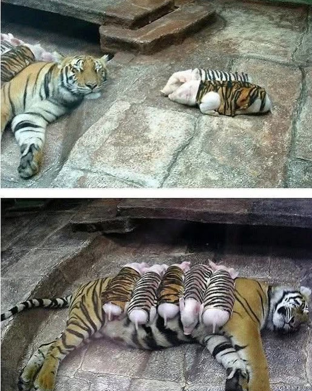 At first, she froze. Her eyes narrowed, her muscles tense. The caretakers held their breath. And then — one of the piglets squealed softly. The tigress tilted her head… then lowered herself, gently wrapping her paws around the piglets 🤱💞.