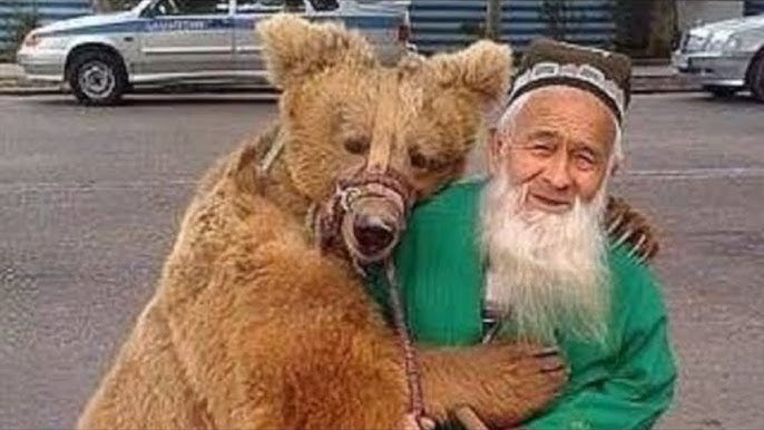 From that day forward, Maria was no wild creature โ she was family. She grew up alongside Sheikhovโs 13 children, learning to walk, play, and even share meals with them. She followed Sheikhov wherever he went โ through fields, across villages, up winding paths of the mountain. In the city of Dushanbe, people would stop and stare in awe at the sight of an old man walking side by side with a massive brown bear, their steps perfectly in sync. ๐โจ