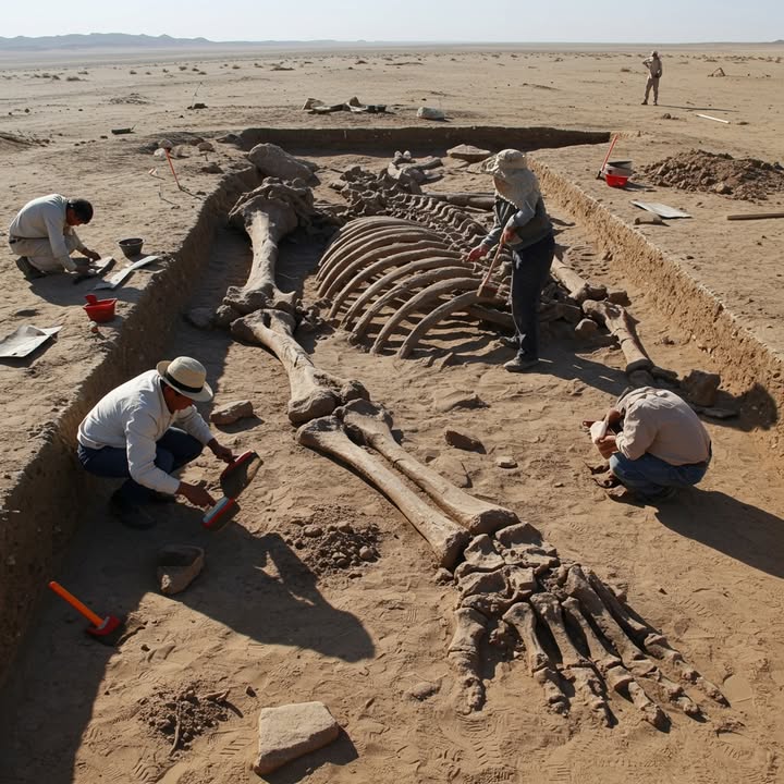 The tranquility of a peaceful riverbank was shattered this week by the discovery of a giant skeleton, plunging local authorities and archaeologists into a profound mystery. Unearthed by severe flooding, the colossal remains—featuring an enormous, elongated skull and massive limb bones—were found half-buried in the silt. This extraordinary find immediately raises more questions than answers: What ancient creature is this? And why was it deposited at this specific location? The phrase “Shadows on the Riverbank” has become synonymous with the haunting uncertainty surrounding the identity of this spectacular, unprecedented specimen.