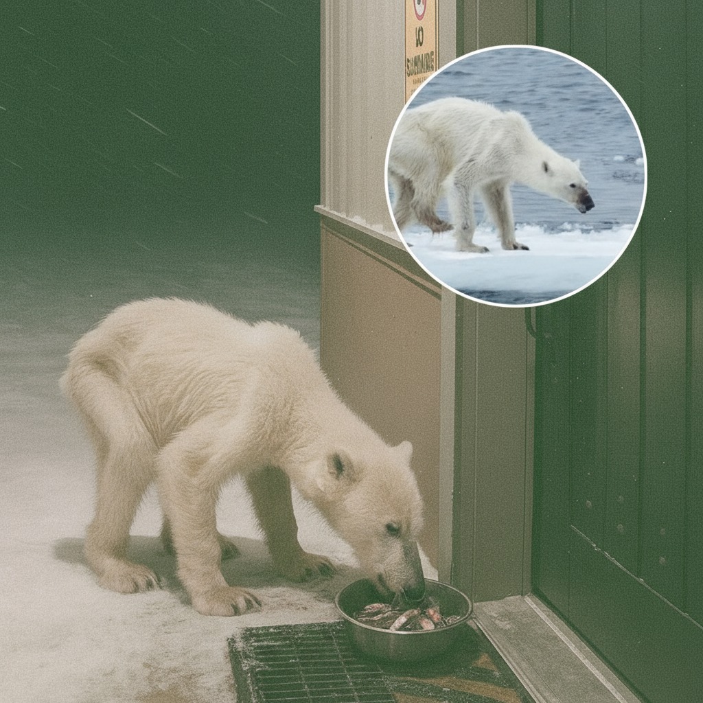 One afternoon, as the weak winter sun began to set, Aris noticed a faint white shape near his camp. At first, he was cautious. A full-grown polar bear is a formidable predator. But as he looked closer through his binoculars, his heart sank. It was a female bear, but her condition was tragic. Her once thick, white coat was matted and patchy, revealing a gaunt, skeletal frame. She moved with a staggering gait, each step seeming to drain the last of her strength. Her eyes, instead of holding the majesty of an arctic queen, shone with desperation. The bear was too weak to hunt. She was slowly starving to death.