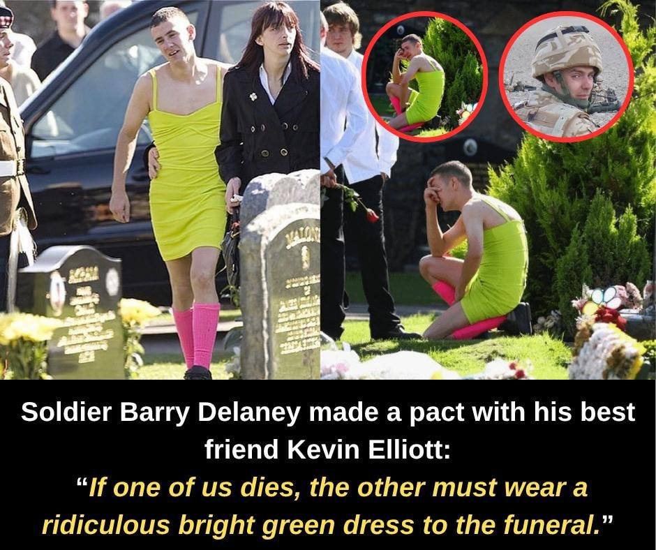 It began, as the best things often do, with laughter. Years before the war, Kevin Elliott and Barry Delaney, two inseparable friends from Dundee, Scotland, made a promise over pints and jokes β a promise that seemed lighthearted at the time. If one of them ever didnβt make it home from Afghanistan, the other would come to the funeral wearing the most ridiculous outfit imaginable β a bright neon dress and pink stockings. ππ