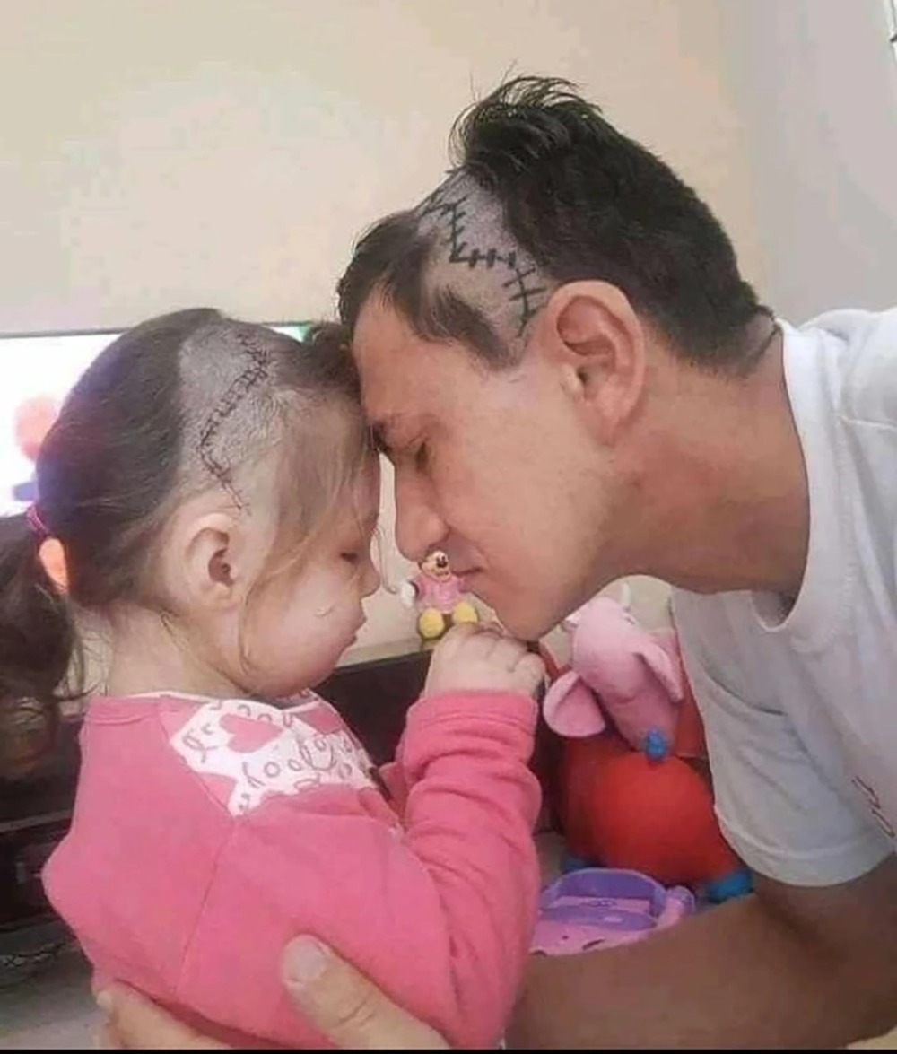 Each stitch tells a story — a story of love that doesn’t flinch, of a bond that pain cannot break. 💞 And one day, when she runs her tiny fingers over the line on her head and traces the same one on his, she’ll know: this was how he said “I love you” when words weren’t enough. 🕊️