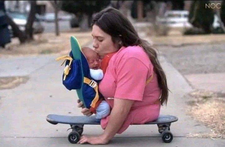 The image that accompanies this story is one of raw, unwavering resilience. It shows a mother who, without the use of her legs, navigates the world on a skateboard, her child held securely in her arms. She doesn’t just roll on a skateboard; she rolls through every obstacle life throws her way, powered by a force far greater than any physical ability: love. She doesn’t need to stand tall because she is already carrying the world in her arms, a world that is her everything.