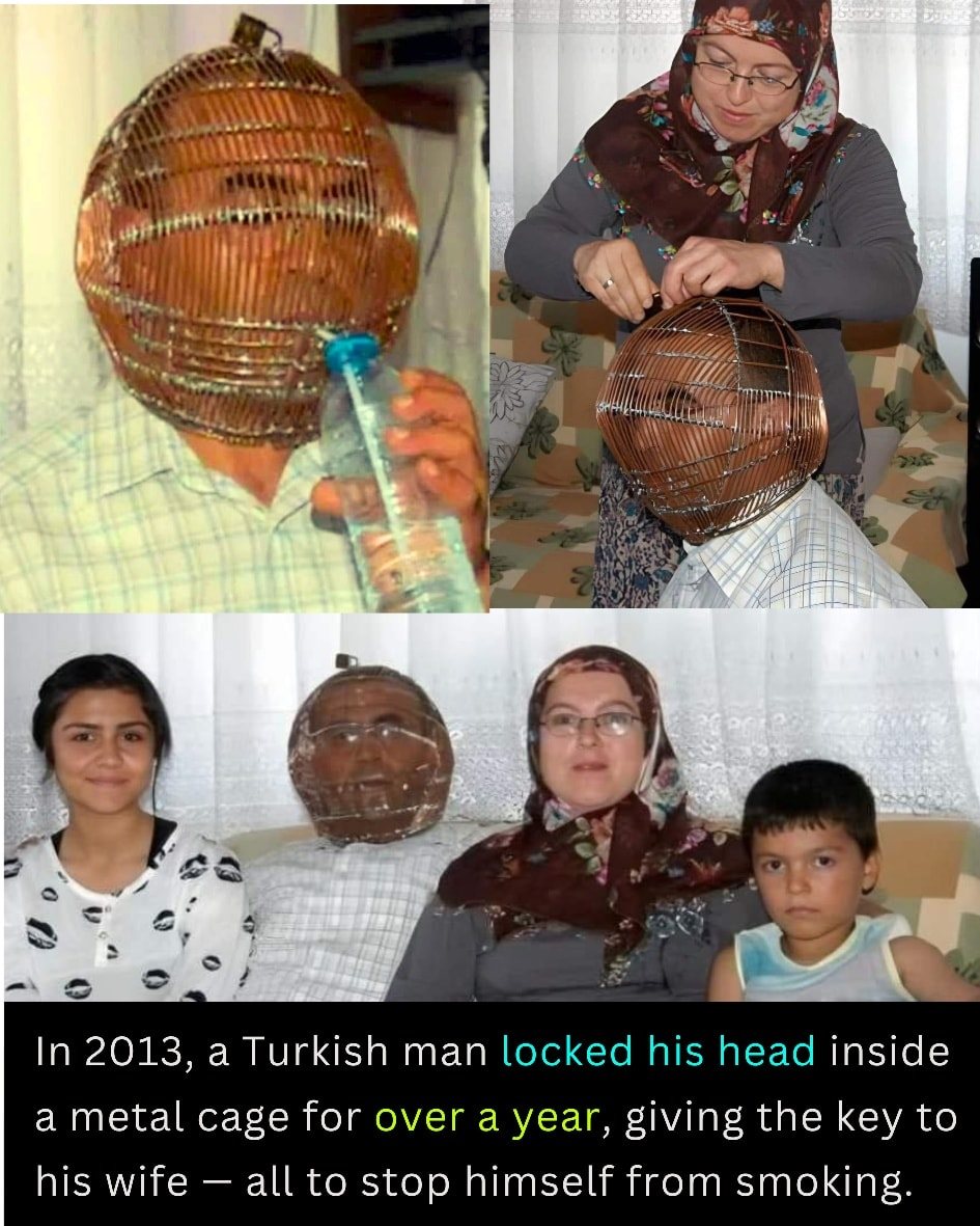 But he knew his willpower alone wasn’t enough. So he did something no one had ever dared to do — he built a metal cage out of wire, shaped like a helmet, and locked his own head inside it. 🔒🪖