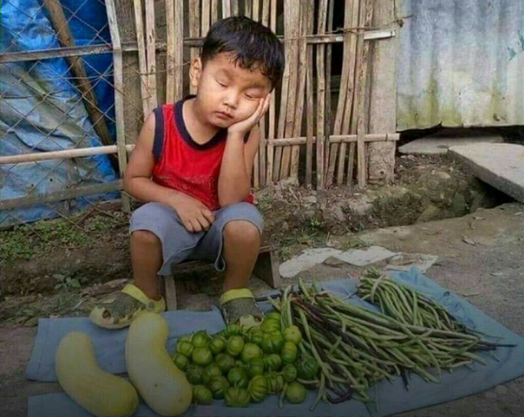 The image is a sobering contrast to the carefree childhood often idealized in our society. While many children are dreaming of new video games or debating which toy to play with next, others are dreaming of something far more fundamental: selling just enough vegetables to afford dinner. This stark reality is captured in the sight of a little boy, not resting after a day of play, but exhausted after working under the relentless sun, helping his family survive just another day.