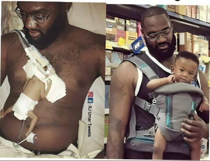 The left panel, “How it Started,” is a raw and unforgettable image. The father is in a hospital bed, engaged in skin-to-skin contact with his incredibly tiny baby—a scene likely set in the Neonatal Intensive Care Unit (NICU). The baby is fragile, covered in medical gear, resting directly on his chest. This is a profound image of a father literally being his child’s incubator, providing essential warmth, comfort, and life force. In that vulnerable moment, a lifelong bond was forged, built through initial fear and a silent, fierce promise to protect. This is where the true resilience of fatherhood was born.